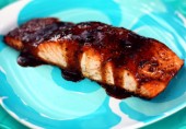 Лосось, маринованный в соевом соусе с чесноком, имбирем, рисовым вином и растительным маслом, смазанный соусом хойсин, посыпанный кунжутом и запеченный в духовке.