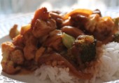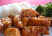 Куриное филе, обжаренное в масле с луком и чесноком и тушеное в соевом соусе с консервированными мандаринами.