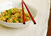 Рис с жареными и мелко нарезанными свиными отбивными, грибами, яйцом, зеленым горошком и специями.