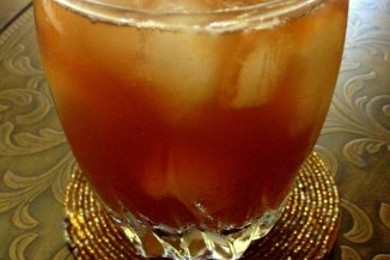 Освежающий напиток из замороженного персика и клубники с крепким зеленым чаем, медом и молоком.