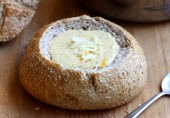 При желании можно подавать, не разливая по тарелкам, а налив в хлебцы, из которых предварительно удалили мякоть.