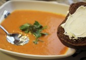 Сливочный суп-пюре из моркови с сельдереем, острым чеддером, чесноком и маскарпоне.