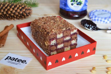 Пропитанный черничным джемом и посыпанный ореховой крошкой шахматный кекс – идеальная десертная выпечка к праздничному чаепитию.