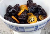Приятный оригинальный десерт. Терпкий вкус чернослива нежно оттеняет мягкий глазированный кумкват.
