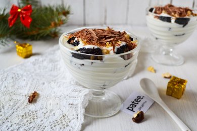 Совершенно простой в приготовлении, но при этом очень вкусный, легкий десерт на основе подкопченного чернослива, с грецкими орехами в сметанном креме.