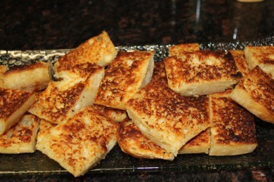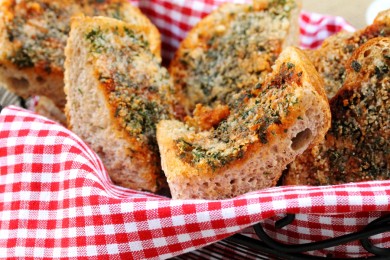 Свежий хлеб, смазанный сырно-чесночной смесью, нарезанный кусочками и запеченный в духовке.