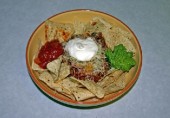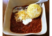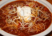 Чили с фаршем индейки, фасолью, зеленым перцем чили, сыром, сметаной и специями.