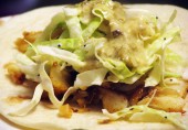 Классические мексиканские вкусы в рыбных тако - пшеничных лепешках с жареной белой рыбой (палтусом, треской и т.