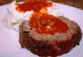 Мясная буханка из говяжьего фарша со сладким перцем, луком и специями, покрытая соусом чили. Приготовьте томатный соус и подавайте с митлофом.