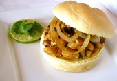 Сэндвичи с куриным филе, приготовленным в цитрусовом соусе со специями, карамелизованным луком и майонезом.