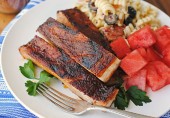 Ребрышки, покрытые смесью сахара с копченой паприкой, порошком чили, луковым и чесночным порошком и горчицей и запеченные в духовке.