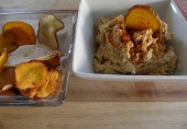 Пикантный хумус с халапеньо и богатые витаминами чипсы из свеклы и репы.