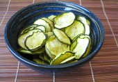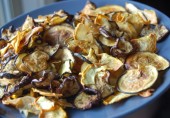 Чипсы из тонко нарезанных баклажана, кабачка и тыквы сквош, обжаренные в духовке.