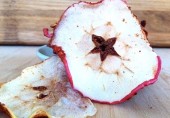 Чипсы из тонко нарезанных яблок с сахаром, корицей, мускатным орехом и морской солью.