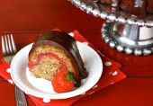 Банановый бундт-торт с клубничной начинкой, покрытый толстым слоем шоколадной глазури.