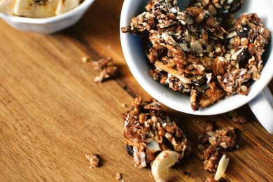 Мюсли с банановыми чипсами, шоколадом, орехами и изюмом.