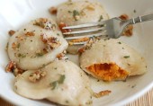 Равиоли с начинкой из сладкого картофеля с пармезаном, политые чесночным соусом с пеканом и зеленью.