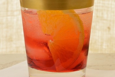 Вкусный напиток из содовой, шампанского и концентрированного сока красного апельсина.