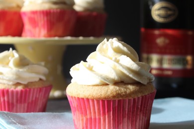 Мини-кексы с клубничным пюре и шампанским, украшенные сливочным кремом с шампанским.