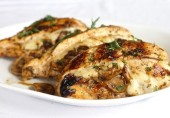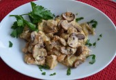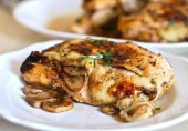 Куриное филе, обжаренное на сливочном масле с грибами, залитое сырным соусом и доведенное до готовности в духовке.