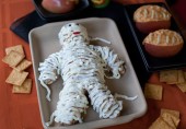 Украсьте свой стол на Хэллоуин сырной мумией с ветчиной, красным перцем и петрушкой, с бинтами из сливочного сыра.