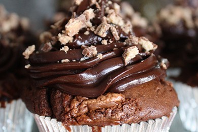 Шоколадные кексы с шоколадными конфетами, покрытые шоколадной глазурью и посыпанные рублеными конфетами.