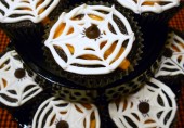 Кексы из шоколадного теста с начинкой из сливочного сыра с сахаром и шоколадными чипсами. Сделайте паутинки из белого шоколада и положите на кексы - вот вам и угощение на Хэллоуин!