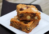 Блонди с арахисовым маслом и чипсами из белого и темного шоколада. Разрежьте на квадраты или прямоугольники и подавайте с чаем или кофе.