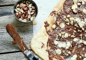Сладкая пицца с нутеллой, рублеными орехами и шоколадом.