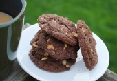 Печенье из шоколадного теста с рублеными орехами макадамии и чипсами из белого шоколада.