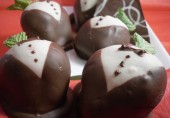 Свежая клубника, покрытая белым и темным шоколадом. Весело и вкусно!