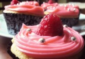 Мини-кексы с белым шоколадом, с начинкой из малинового пюре, украшенные сливочным кремом с растопленным белым шоколадом.