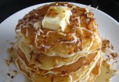 Пышные блины на молоке с жареной кокосовой стружкой и белым шоколадом. Подавайте блины с маслом, кленовым сиропом и кокосовой стружкой.