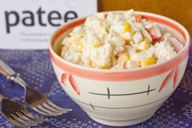 Этот вариант рецепта крабового салата с кукурузой популярен во многих семьях! Классический состав ингредиентов дополнен рисом, который делает салат крабовый более нежным на вкус, а красное яблоко придаёт пикантную нотку!