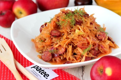 Тушеная квашеная капуста с охотничьими колбасками и яблоками