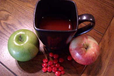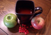 Горячий сидр из яблочного и клюквенного сока с коричневым сахаром, яблоком, корицей, апельсином и гвоздикой.