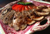 Отбивные из свинины, обжаренные на сковороде и запеченные в соусе из яблочного сидра с грушей и клюквой.