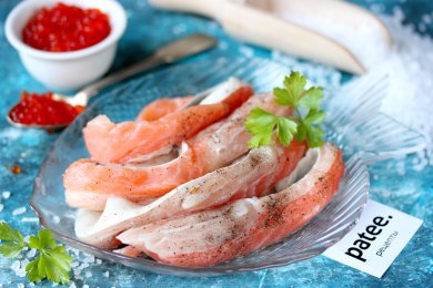 Вкусные и быстрые в приготовление стейки из лосося под соусом из розового перца.
