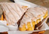 Булочки из теста с тыквенным пюре, сливками, ванилином и корицей, политые глазурью из сахарной пудры с корицей и молоком.