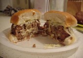 Бургер из фарша индейки (или куриного фарша, на ваше усмотрение) с капустой, острым чеддером, острым соусом и майонезом.