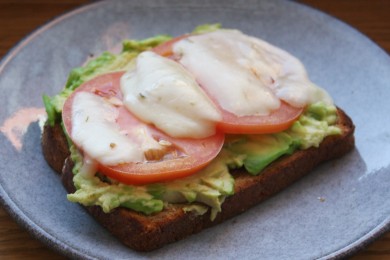 Отличный завтрак - бутерброд из ломтя цельнозернового хлеба с авокадо, помидором и сыром, обжаренный под бройлером.
