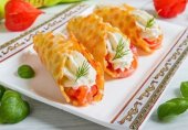 Готовим оригинальное и эффектное рыбное блюдо, которое выглядит презентабельно и удобно в подаче! Эти румяные чудо-палочки ни что иное как вафельные трубочки, фаршированные рыбными консервами с добавлением вареного риса и жареного лука.