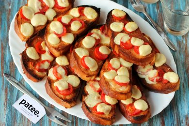 Готовим вкусные закусочные гренки с ароматным чесноком, кружочками помидоров черри и маленькими шариками беби-моцареллы!