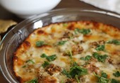 Мексиканская закуска из сыра с жареными грибами, чесноком и специями, посыпанная свежей зеленью.