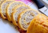 Такой рулет украсит любой праздничный стол. Подавать можно как в холодном, так и в горячем виде.
