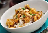 Куриное филе, обжаренное в масле, с устрично-соевым соусом и орехами кешью. Подавайте с рисом, посыпав зеленым луком.