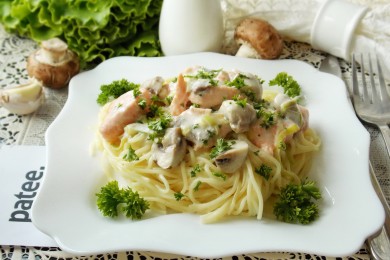 Лосось, припущенный со сливочным соусом и морепродуктами