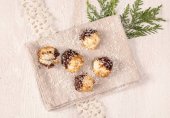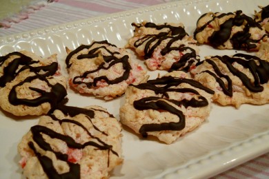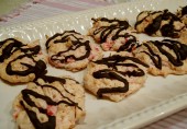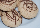 Печенье с кокосовой стружкой, ванильным и миндальным экстрактами, украшенное растопленным шоколадом.