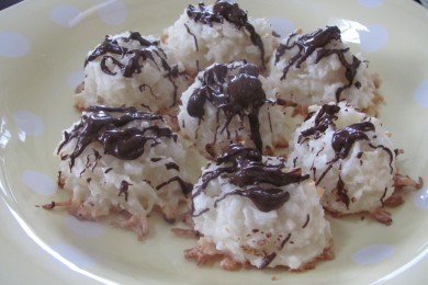 Макаруны - американское печенье с кокосовой стружкой. Попробуйте макаруны с шоколадом и вишней, политые растопленным шоколадом.