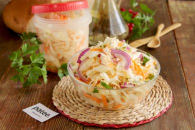 В этом салате знакомые компоненты: репчатый лук, подсолнечное масло, чеснок и маринованная капуста, она обогащена южноазиатской вкусовой гаммой, которую обеспечивает ароматизированное подсолнечное масло.